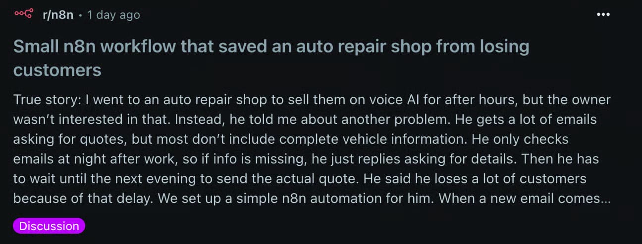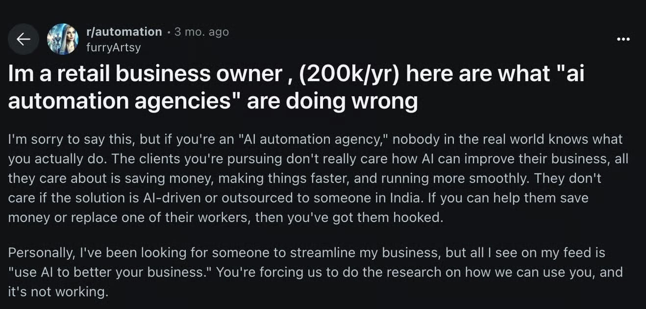 Take this example: a guy on Reddit shared that he walked into an auto repair shop intending to pitch an AI phone answering system. But once he sat down with the owner, it was clear that wasn’t the real issue.